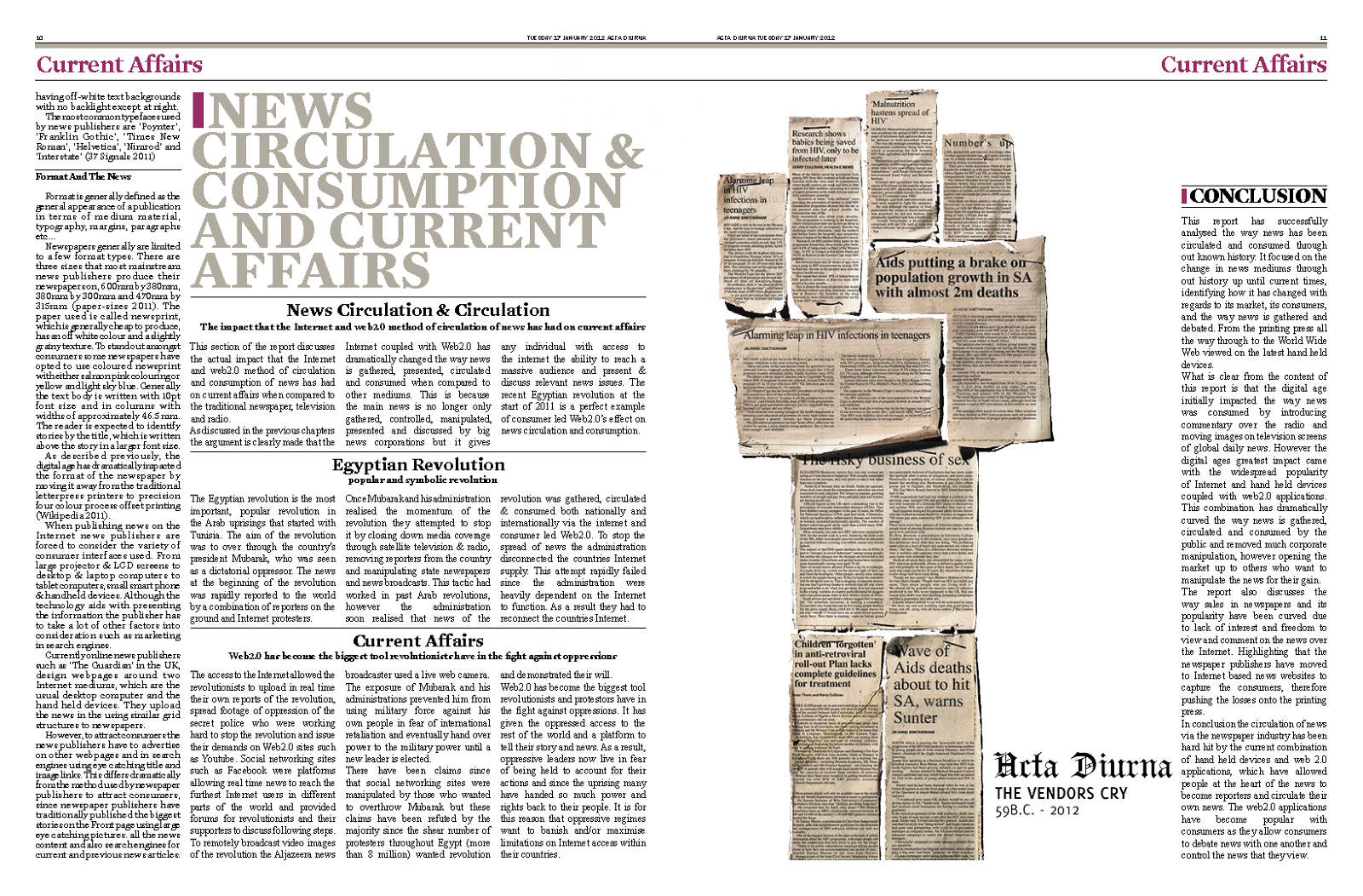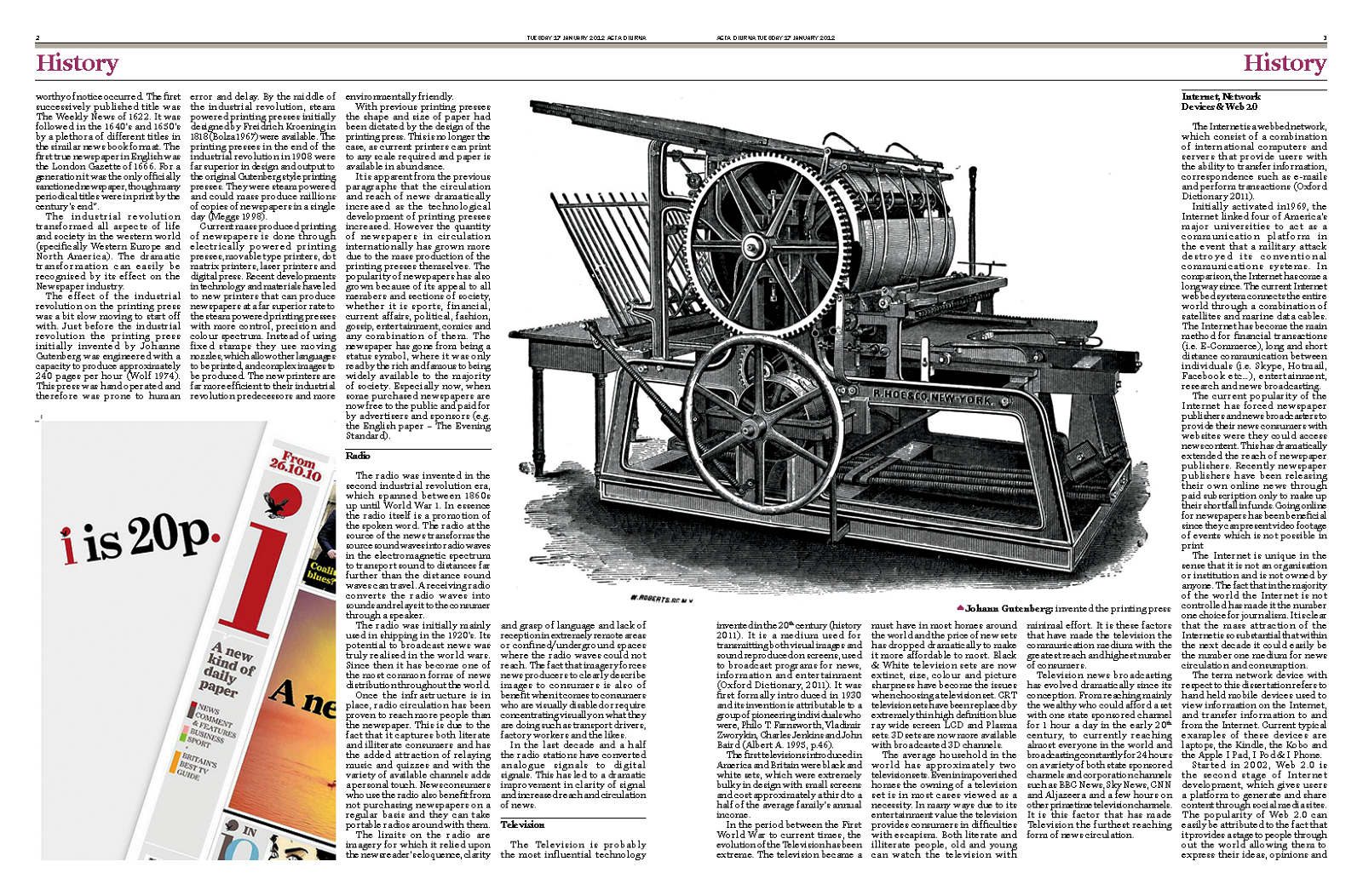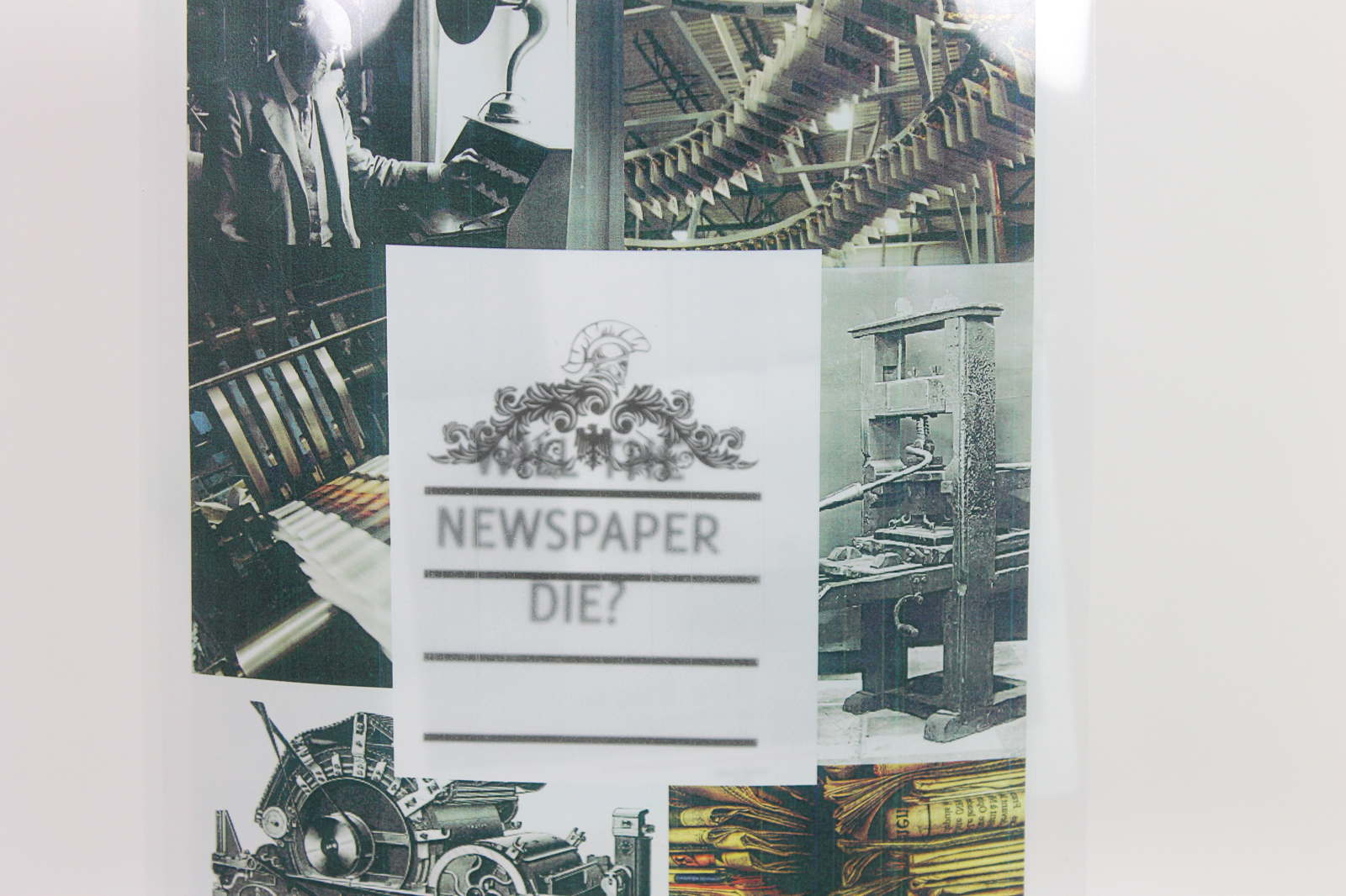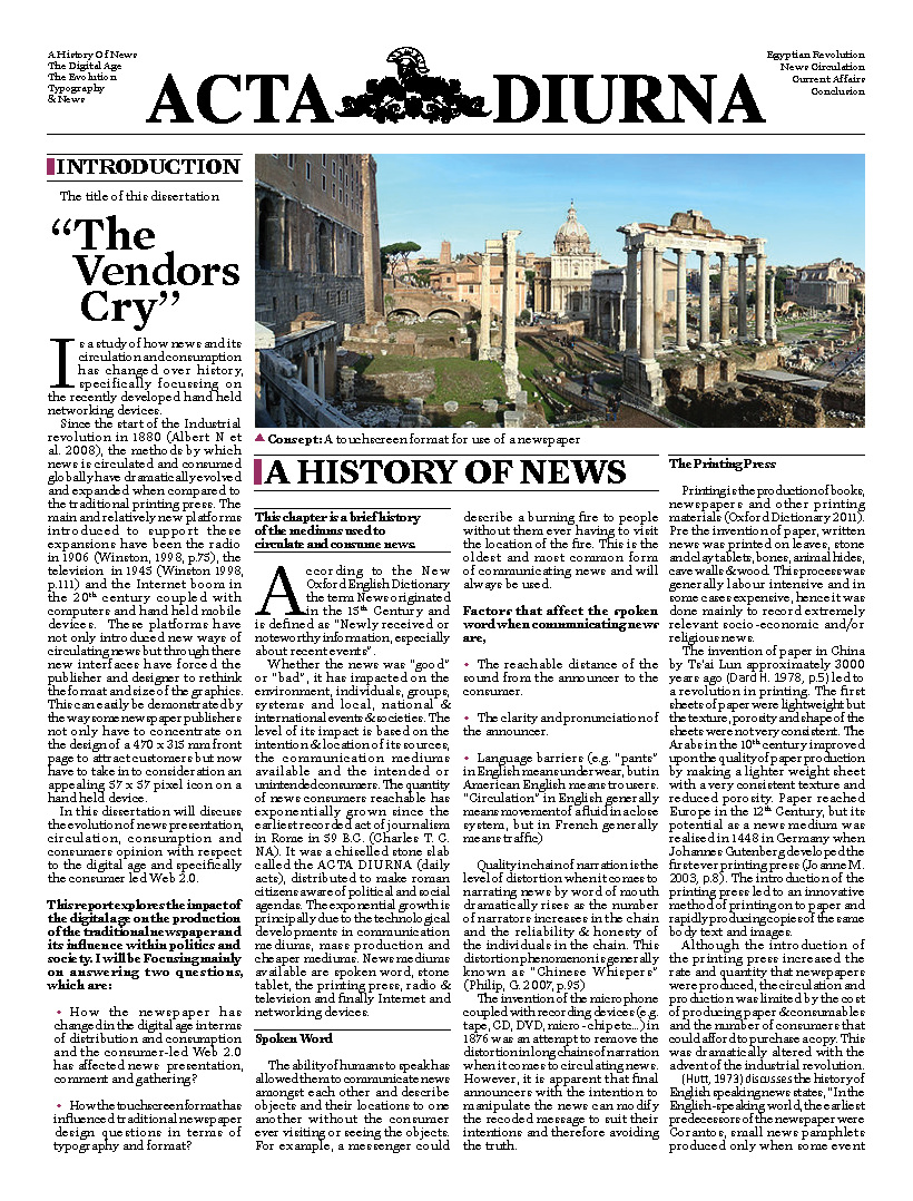 Create Acta Diurna, a newspaper for my dissertation on news development, expressing past and future influences with a three-dimensional element.